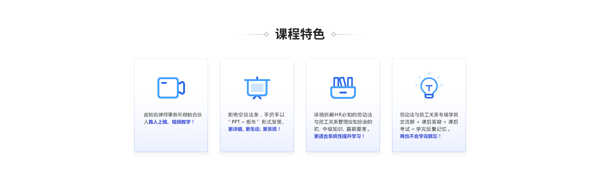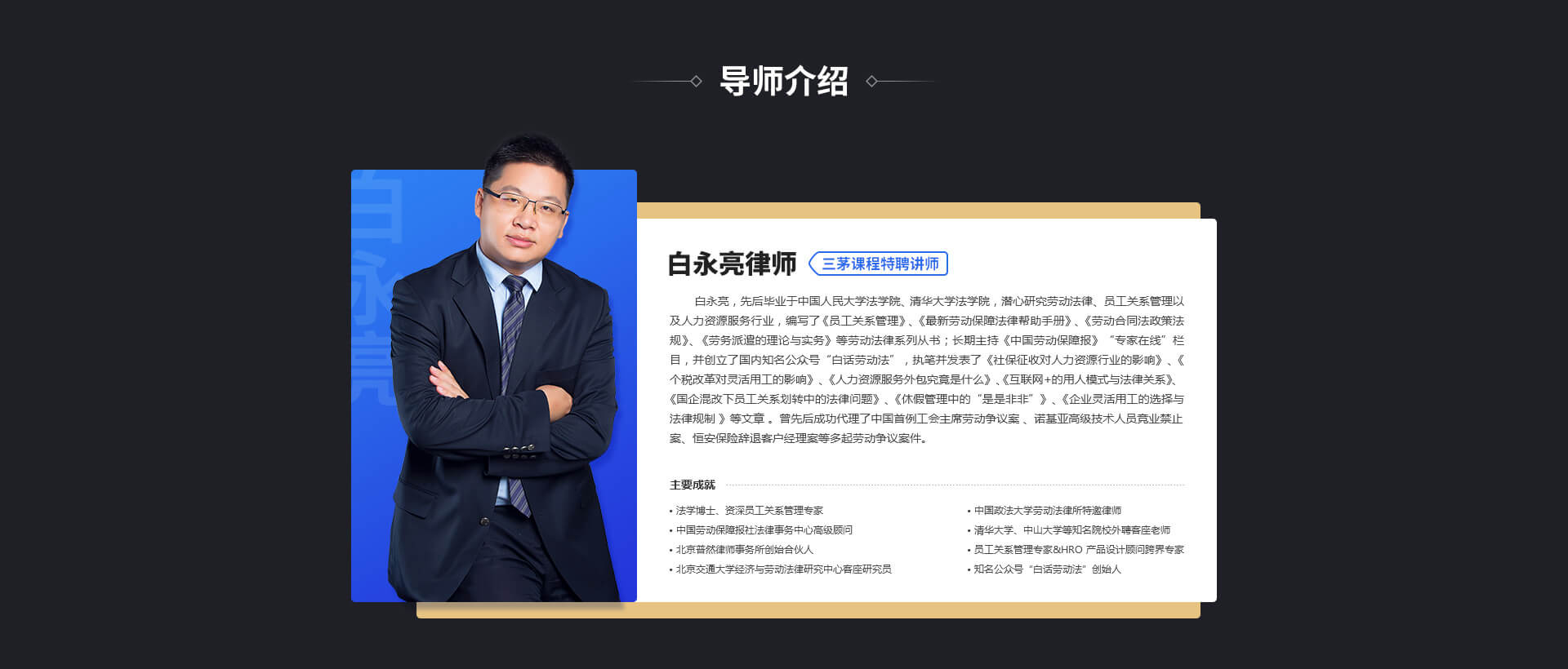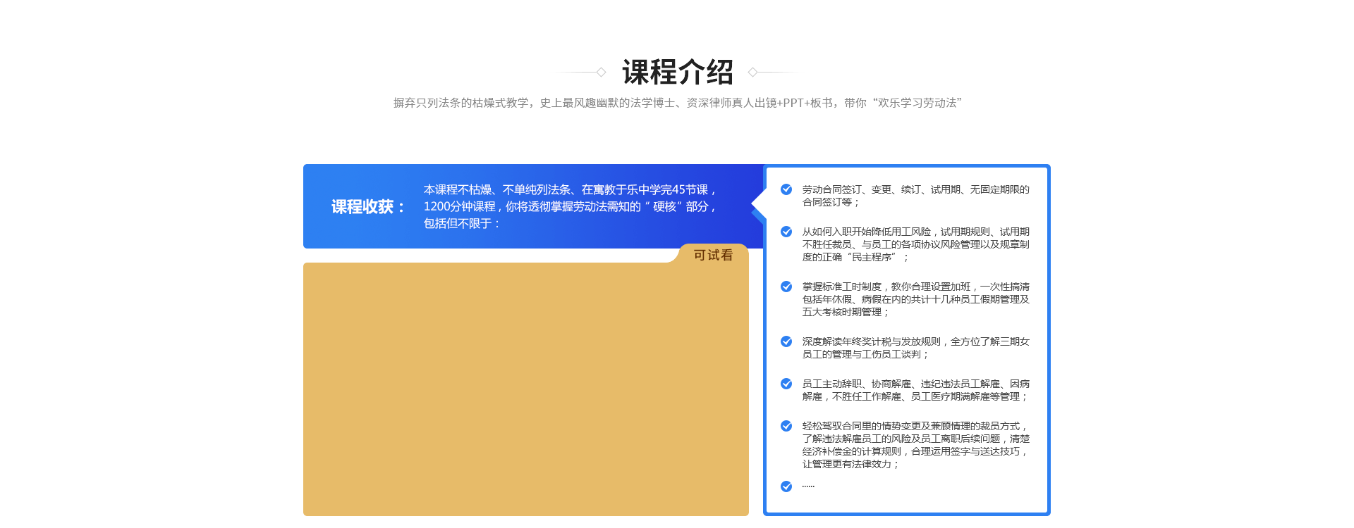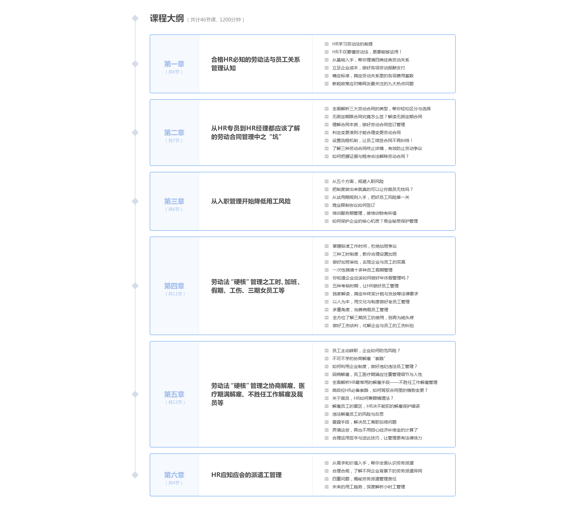 本课程由国内资深知名律师主讲,聚焦实战,手把手教你如何避免99%的劳动风险。包含但不限于最新热点问题、劳动合同管理、入离职管理、在职管理、特殊用工管理等课程。