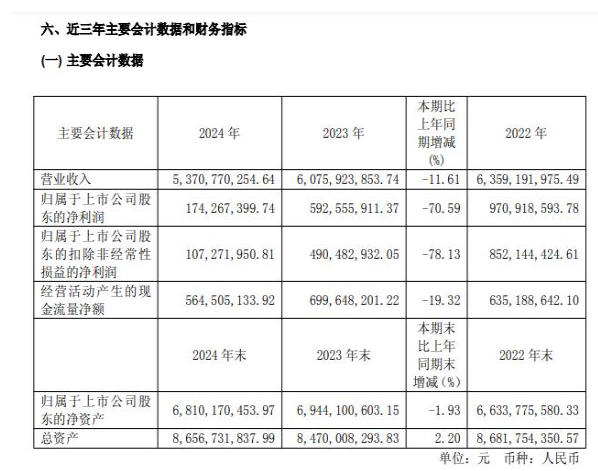 华熙生物2024年年报显示,在报告期内,该公司实现营业收入53.71亿元,同比下降11.61%;归属于上市公司股东的净利润为1.74亿元,同比下降70.59%;归属于上市公司股东的扣除非经常性损益的净利润为1.07亿元,同比下降78.13%。