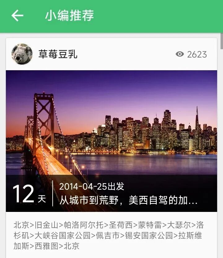 行程助手上的信息之过时滞后,从APP内的编辑推荐页也可见一斑——排在首位的推荐内容,竟是2014年出发的自驾美国西海岸攻略。但看看上个时代旅人们的精神状态也挺好,至少在那个世界里,湾区说走就走,也不用去思考太多签证的麻烦。