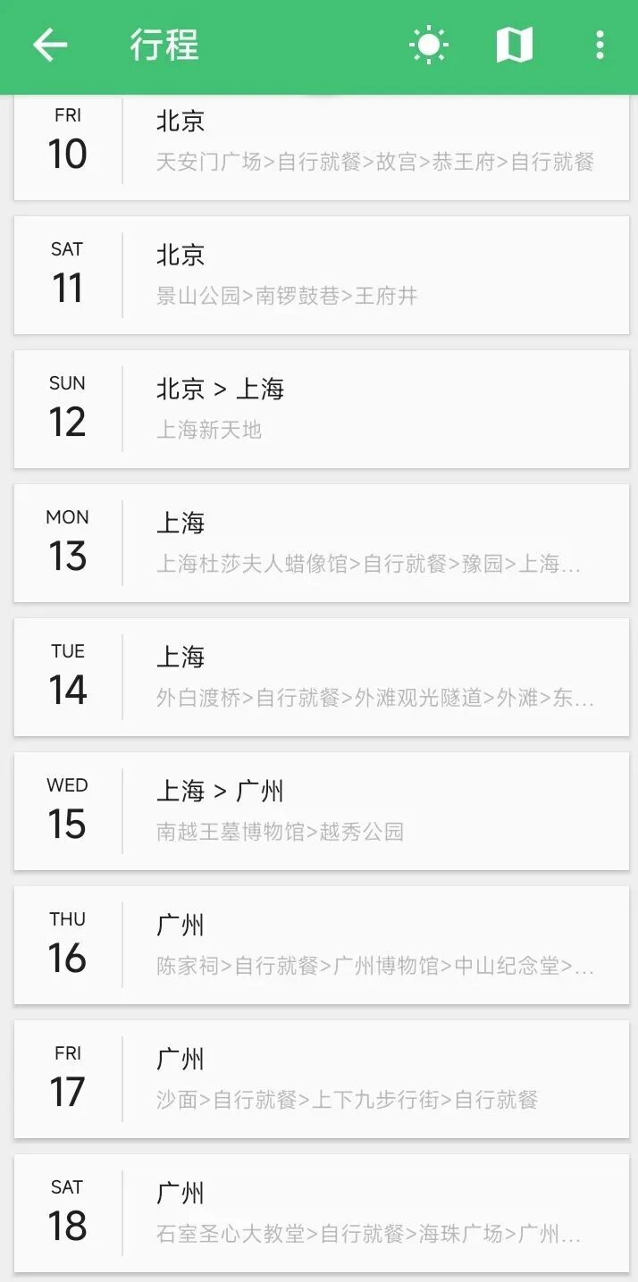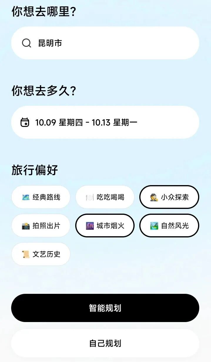 行程中的景点可以自行添加,也可由系统生成。我假装外宾,请它帮我自动生成了一份北上广10天的旅行行程。系统选择的都是最大众热门的景点,不说乏善可陈,起码是一点2025年的气息都没有,行程老实得像是从Lonely Planet出版时穿越过来的旅行者,更像是从没经历过移动互联网眼花缭乱的信息洗礼一样。