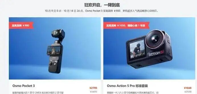 其中,Osmo Pocket 3标准版直降700元,全能套装降幅达900元,运动相机Action 4最高降价949.8元。这场被明确为“双11”提前预热的促销,将从10月9日0点持续到10月14日24点。