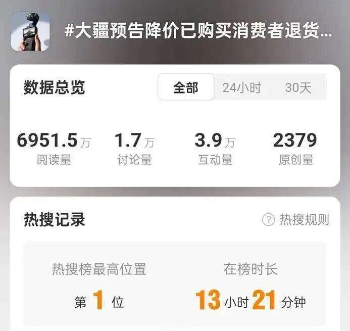 社交媒体上,“大冤种” 的自嘲与维权声浪迅速将大疆推上热搜,线上线下渠道的售后标准差异更引发热议。
