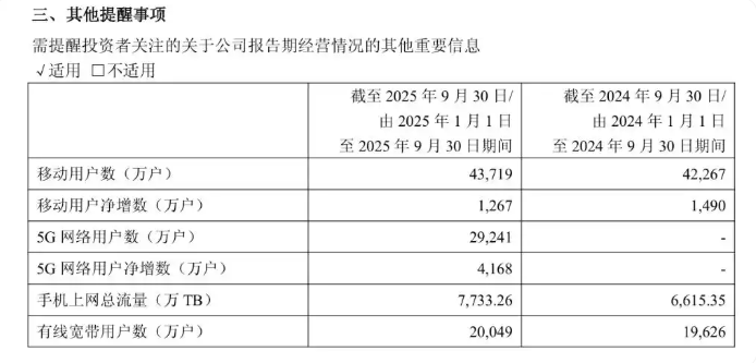 与新兴业务的亮眼表现形成对比,中国电信的传统基础业务面临增长放缓的压力。截至9月30日,公司移动用户总数达到4.37亿户,5G网络用户渗透率提升至66.9%。然而,从用户增长看,前三季度移动用户净增数为1267万户,低于去年同期的1490万户。同样,有线宽带用户净增数也从去年同期的610万户大幅放缓至今年的305万户。