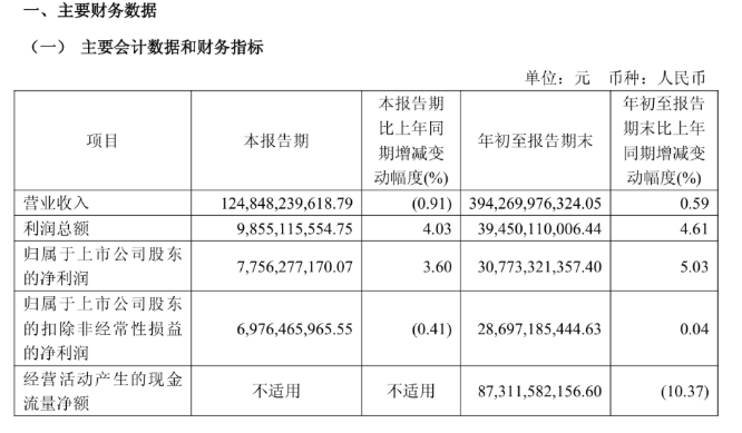 (2)归属于上市公司股东的净利润同比增长3.60%,达到77.56亿元。