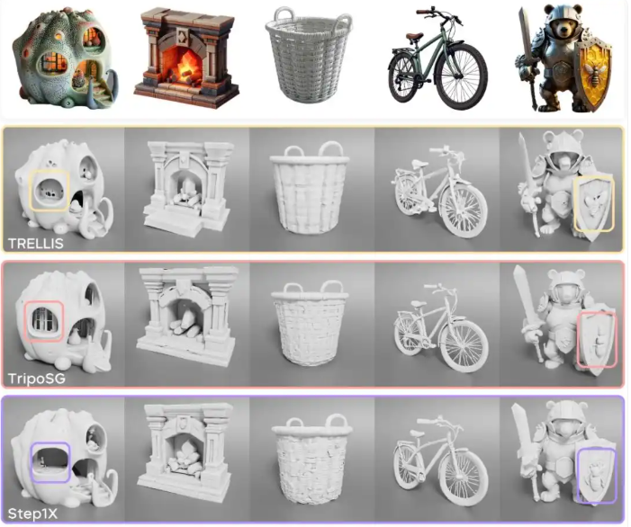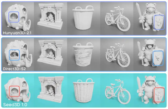 官方提供的测试结果称,Seed3D 1.0 在细节保持和结构完整性方面优于其他方法,1.5B 参数的 Seed3D 1.0 在性能上超过了业界 3B 参数的模型(Hunyuan3D-2.1),能够更准确地还原复杂物体的精细特征。