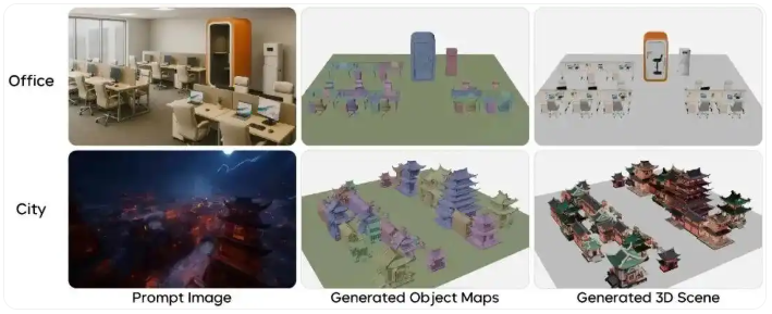 采用分步生成策略,Seed3D 1.0 还可从生成单一物体拓展至生成完整、连贯的 3D 场景。系统能够首先利用视觉语言模型从输入图像中提取对象和空间关系的信息,构建场景布局图;然后为每个对象生成相应的 3D 模型;最后根据空间布局将各个物体组装成完整场景。这一框架使 Seed3D 1.0 能够生成丰富的 3D 环境,从办公室空间到城市街景,为世界模拟器提供了场景内容支撑。