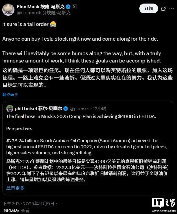 马斯克今日转发了一条贴文,其中提到:“马斯克 2025 年薪酬计划的‘终极目标’是实现 4000 亿美元(IT之家注:现汇率约合 2.85 万亿元人民币)息税折旧摊销前利润(EBITDA)。2382.4 亿美元 —— 这是沙特阿拉伯国家石油公司(沙特阿美)2022 年创下的史上最高年度 EBITDA。彼时受全球油价高企、销量增长、地缘政治紧张及疫情后需求复苏推动,该公司炼油利润率表现强劲。这一数字远超埃克森美孚(2022 年为 1025.9 亿美元)、英伟达(2024 财年为 344.8 亿美元)等其他巨头企业。”