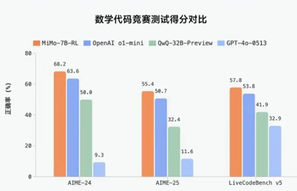 文章称,在数学推理(AIME 24-25)和代码竞赛(LiveCodeBench v5)公开测评集上,MiMo仅用7B的参数规模,超越了OpenAI的闭源推理模型o1-mini和阿里Qwen更大规模的开源推理模型 QwQ-32B-Preview。