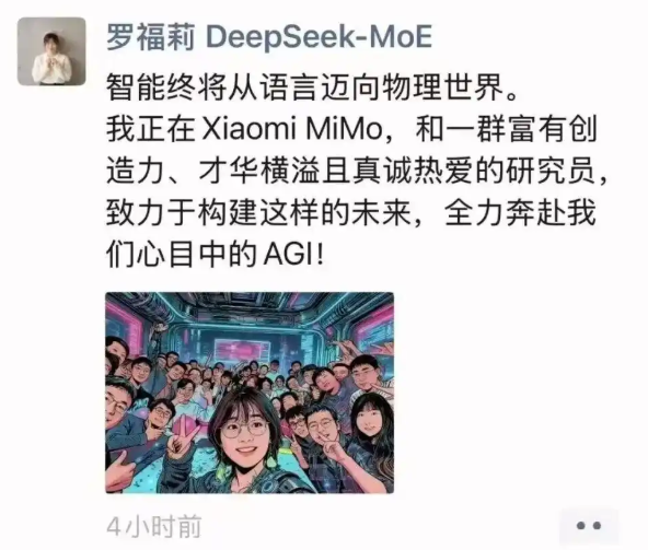 罗福莉在朋友圈发文:“智能终将从语言迈向物理世界。我正在Xiaomi MiMo,和一群富有创造力、才华横溢且真诚热爱的研究员,致力于构建这样的未来,全力奔赴我们心目中的AGI。”