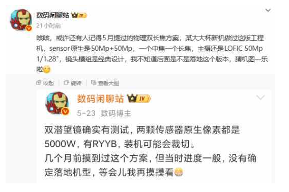 配置方面,博主“数码闲聊站”透露,某厂商“大大杯”工程机搭载 5000 万像素主摄(1/1.28 英寸 LOFIC 传感器)及双 5000 万像素中长焦镜头,镜头模组延续经典设计。结合其评论区讨论及博主配图中的暗示,该工程机预计对应 Mate80 Pro Max 机型。