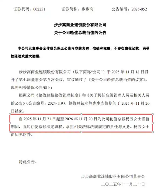 同时,步步高还披露了《公司轮值总裁当值的公告》,现任轮值总裁邓静先生将于2025年11月20日期满,自11月21日起由杨芳女士接任,任期一年,依法行使总裁职权并承担相应义务。