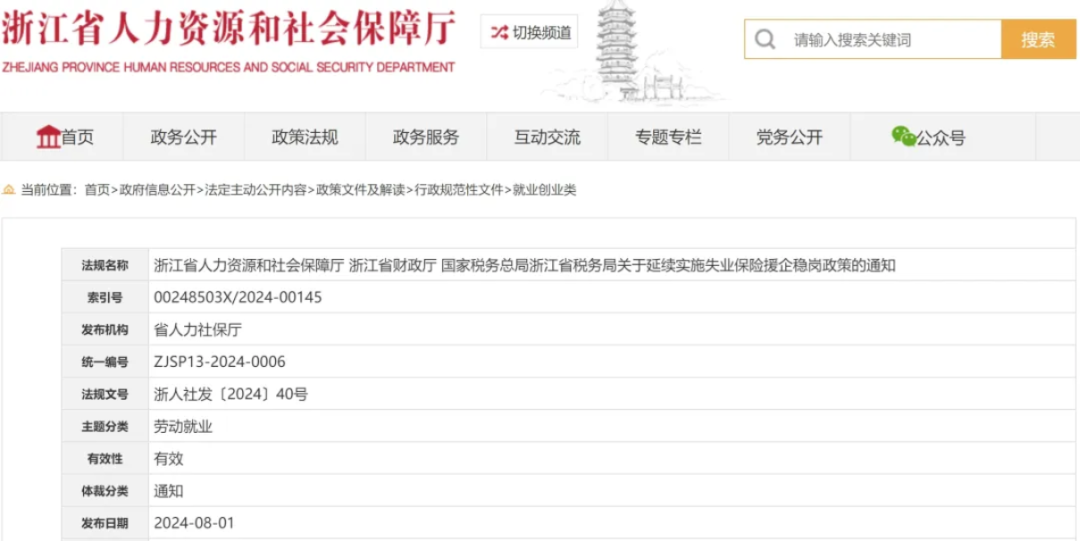 浙江省人力资源和社会保障厅等部门发布《关于延续实施失业保险援企稳岗政策的通知》。