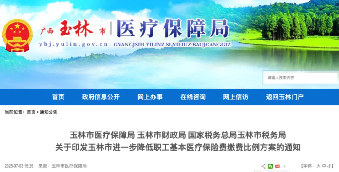 三、广西玉林7月3日,玉林市医保局等部门发布《关于印发玉林市进一步降低职工基本医疗保险费缴费比例方案的通知》