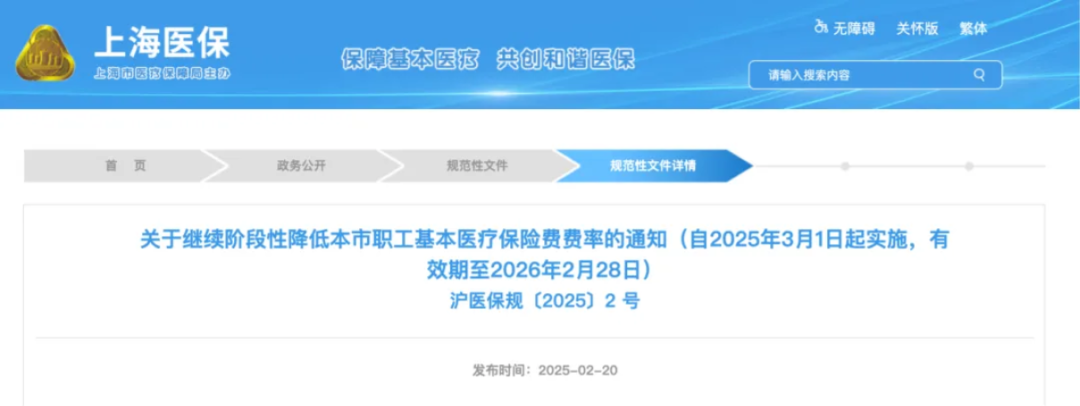 上海市医保局等部门发布《关于继续阶段性降低本市职工基本医疗保险费费率的通知》。该通知自2025年3月1日起实施,有效期至2026年2月28日。
