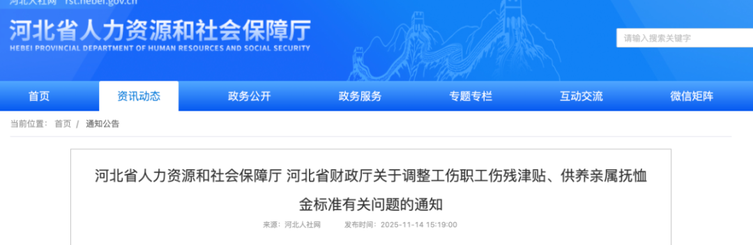 河北省人力资源和社会保障厅发布关于调整工伤职工伤残津贴、供养亲属抚恤金标准有关问题的通知