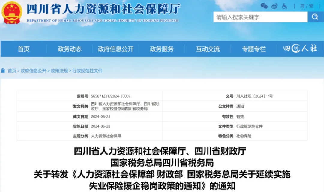 四川省发布《关于转发人力资源社会保障部 财政部 国家税务总局<关于延续实施失业保险援企稳岗政策的通知>的通知》。