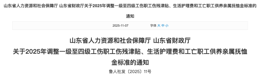 山东省人力资源和社会保障厅发布关于2025年调整一级至四级工伤职工伤残津贴、生活护理费和工亡职工供养亲属抚恤金标准的通知