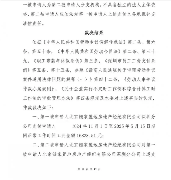 11月4日,深圳市福田区劳动人事争议仲裁委员会作出深福劳人仲案【2025】4897号裁决。仲裁委采信了吴女士关于“月工资标准6000元”的主张,裁决链家深圳分公司支付吴女士2024年11月1日至2025年5月15日期间的工资差额16828.51 元,链家承担补充清偿责任。