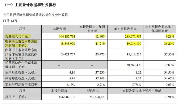 业绩方面,财报数据显示,宁德时代在今年前三季度实现归母净利润490亿元,同比增长36.20%,营收2831亿元,同比增长9.28%;单三极度,公司实现归母净利润185.49亿元,同比增长41.21%,实现营收1043.86亿元,同比增长12.90%。
