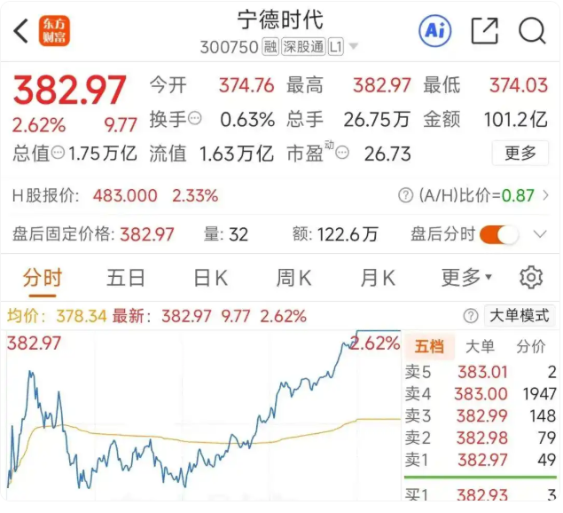 二级市场上,12月1日,宁德时代A股尾盘拉升,收于382.97元/股,涨幅为2.62%,总市值为1.75万亿元。