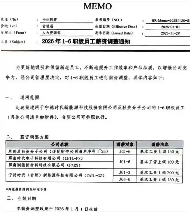 近日,有网友爆料了一份宁德时代新能源科技股份有限公司(下称“宁德时代”)发布的《2026年1-6级员工资调整通知》。
