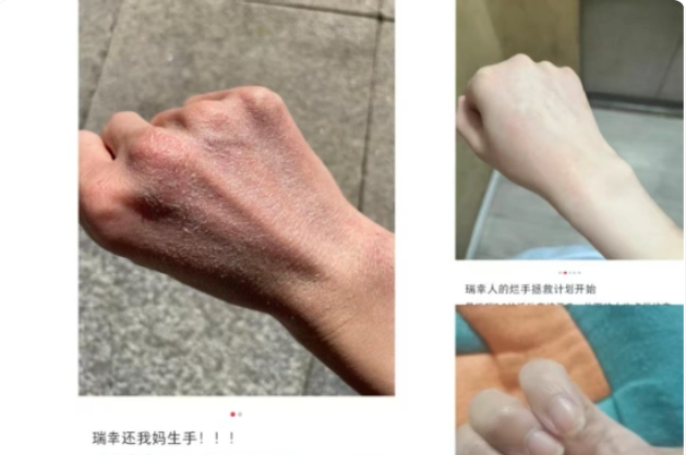 此外,在社交媒体上搜索“瑞幸”和“烂手”这组关键词,还会看到一张张伤痕累累的手部照片。根据发帖者们描述,由于在瑞幸咖啡工作时频繁洗手以及徒手接触消毒水等缘故,工作一段时间后手部皮肤会变得粗糙,甚至出现皲裂、褪皮等现象