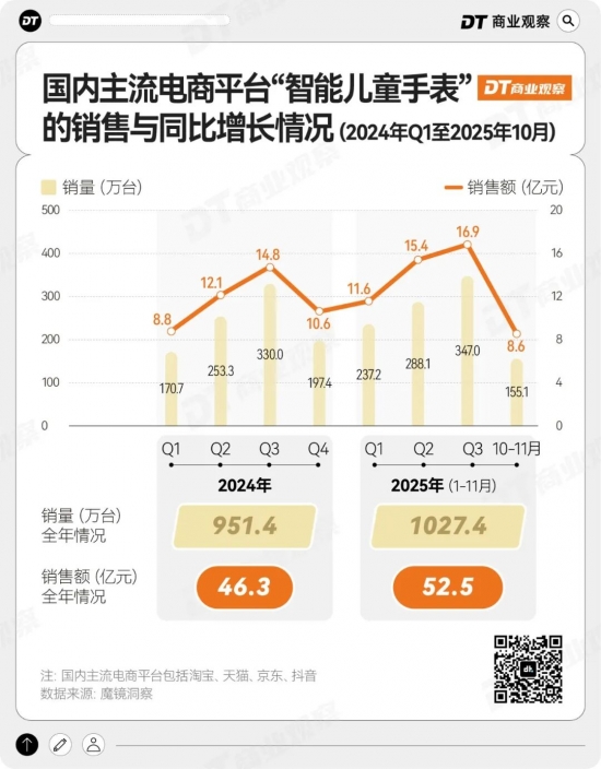 魔镜洞察的数据显示,2025年1-11月,智能儿童手表在国内主流电商平台的销售额达52.5亿,超过了2024年全年(销售额46.3亿);销量1027.4万台,比2024年整年销量(销量951.4万台)多出了约76万台。