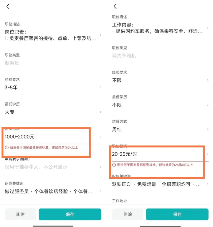 值得一提的是,“合理薪资范围”机制并非只作用于高薪,也会识别低薪。薪资低于国家规定的当地最低工资标准的职位,同样会被系统提示。