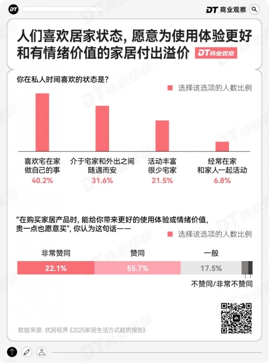 优居视界《2025 家居生活方式趋势报告》显示,40.2% 的人在私人时间偏爱 “宅家做自己的事”, 77.8% 的消费者愿意为能带来情绪价值的家居支付溢价。