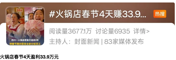 据媒体报道,2月20日(年初四),四川遂宁七里川火锅店老板黄厚明,将春节除夕至初三,4天的盈利全部分给6家门店140多名员工。