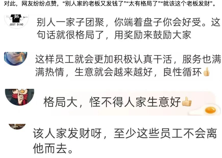 不画饼、不作秀,将春节4天利润全部分给员工,这已是第四年坚守。这位老板曾是一线服务员,深知春节坚守的不易,懂得将心比心,把员工的付出放在心上。餐饮行业,做的是烟火生意,暖的是人心。