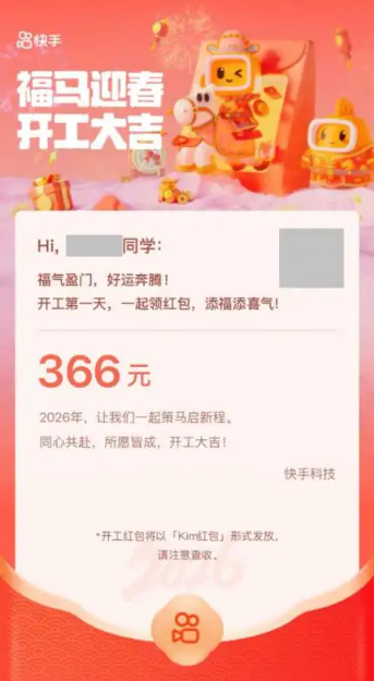 快手给员工发放开工红包,正式员工每人366元。根据员工晒出的截图,红包中写道:“2026年,让我们一起策马启新程。同心共赴,所愿皆成,开工大吉。”