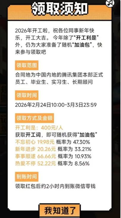 腾讯面向正式员工、毕业生、实习生、长期顾问发放开工红包,金额为400元。