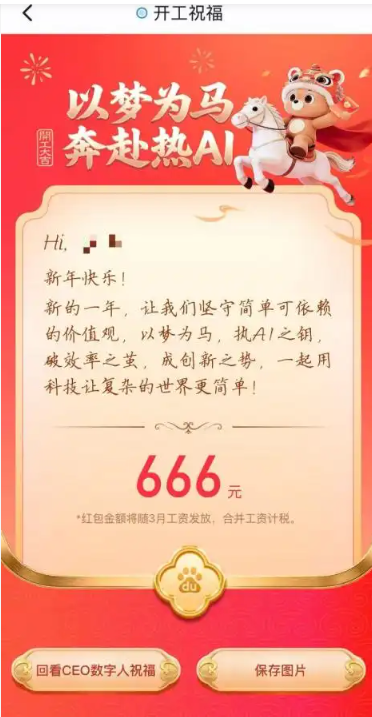 据了解,百度创始人李彦宏的数字人通过工作软件“如流”的服务号向员工发放开工红包,红包金额为365元、588元、666元、888元、2026元不等,实习生则可获得188元。