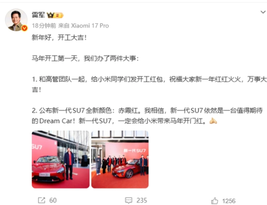 小米公司这边,雷军现身公司给员工亲自发放开工红包。他发布微博称:和高管团队一起,给小米同学们发开工红包,祝福大家新一年红红火火,万事大吉!